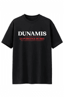 Minimaliste. Radical. Puissant. Au centre, DUNAMIS en capitales blanches imposantes. Juste en dessous, en rouge intense : LA PUISSANCE DE DIEU, soulignée pour renforcer l’autorité du message. Le contraste blanc / rouge sur noir crée une tension visuelle forte. Sobre… mais impossible à ignorer.